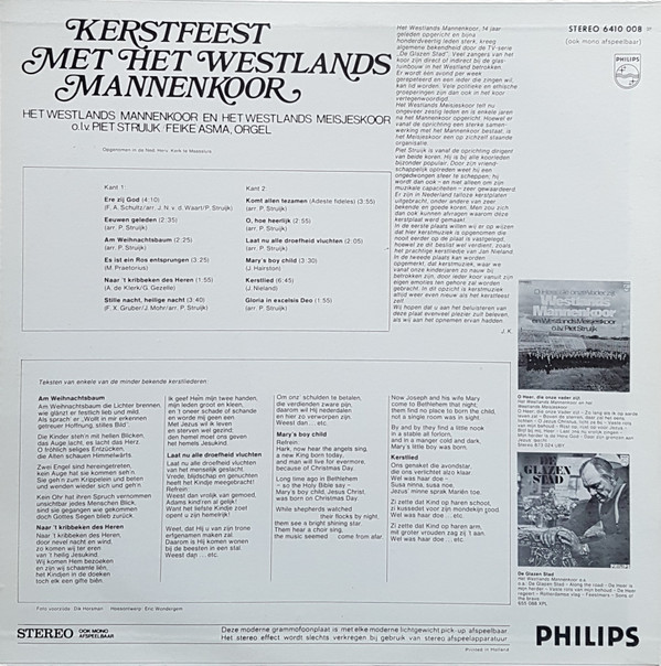 Westlands Mannenkoor En Westlands Meisjeskoor o.l.v. Piet Struijk / Feike Asma – Kerstfeest Met Het Westlands Mannenkoor (LP, Album)