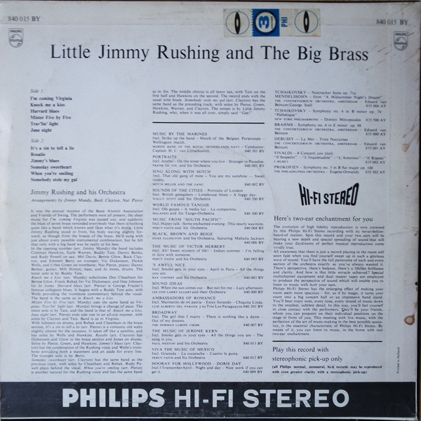 € 7.50 Media: Very Good Plus (VG+)Hoes: Very Good (VG)Jimmy Rushing And His Orchestra – Little Jimmy Rushing And The Big Brass (LP, Album)