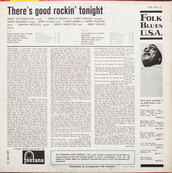 € 11.50 Media: Near Mint (NM or M-)Hoes: Very Good Plus (VG+)Jimmy Witherspoon – There’s Good Rockin’ Tonight (LP, Album, Mono)