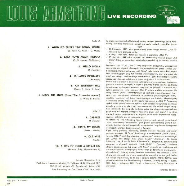 € 5.00 Media: Good Plus (G+)Hoes: Very Good (VG)Louis Armstrong – Live Recording (LP, Blu)