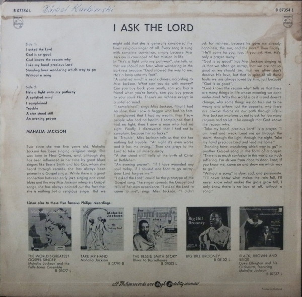 € 6.50 Media: Very Good Plus (VG+)Hoes: Very Good (VG)Mahalia Jackson – I Ask The Lord (LP, Comp, Mono)
