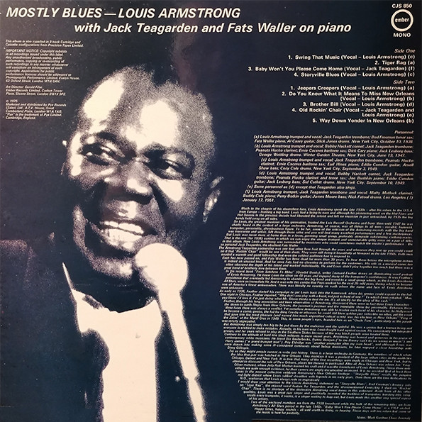 € 6.50 Media: Near Mint (NM or M-)Hoes: Very Good Plus (VG+)Louis Armstrong – Mostly Blues (LP, Album, Mono)