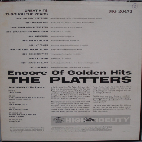 € 6.50 Media: Very Good (VG)Hoes: Very Good Plus (VG+)The Platters – Encore Of Golden Hits (LP, Comp, Mono)