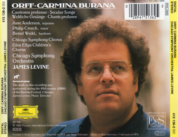 € 9.50 Media: Very Good Plus (VG+)Hoes: Very Good Plus (VG+)Carl Orff / June Anderson, Bernd Weikl, Philip Creech, Chicago Symphony Chorus And Chicago Symphony Orchestra, James Levine (2) – Carmina Burana (CD, Album, RP, PDO)