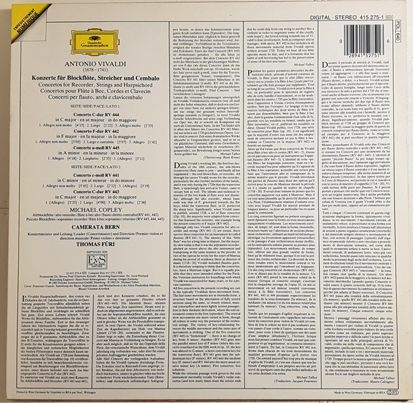 € 4.00 Media: Very Good (VG)Hoes: Very Good Plus (VG+)Antonio Vivaldi – Michael Copley, Camerata Bern – Konzerte Für Blockflöte = Recorder Concertos (LP, Album)