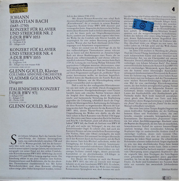 € 8.00 Media: Very Good Plus (VG+)Hoes: Near Mint (NM or M-)Johann Sebastian Bach – Glenn Gould / Columbia Sinfonie-Orchester* / Vladimir Golschmann – Konzerte Für Klavier Und Streicher Nr. 2 E-Dur BWV 1053 / Nr. 4 A-Dur BWV 1055 / Italienisches Konzert F-Dur BWV 971 (LP, Comp)