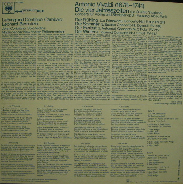 € 8.50 Media: Very Good Plus (VG+)Hoes: Very Good Plus (VG+)Antonio Vivaldi, John Corigliano*, Leonard Bernstein, Mitglieder Der New Yorker Philharmoniker* – Die Vier Jahreszeiten (Le Quattro Stagione) (LP)