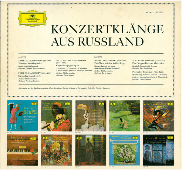 € 11.00 Media: Very Good (VG)Hoes: Very Good Plus (VG+)Aram Khatchaturian, Pyotr Ilyich Tchaikovsky, Modest Mussorgsky, Alexander Borodin, Nikolai Rimsky-Korsakov – Konzertklänge Aus Russland (LP, Comp, RE)