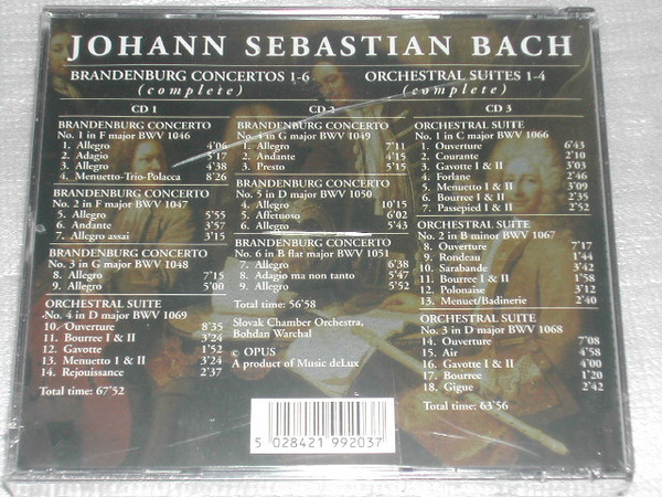 € 6.50 Media: Very Good (VG)Hoes: Very Good Plus (VG+)Bach*, Bohdan Warchal, Slovak Chamber Orchestra – Brandenburg Concertos 1-6 (Complete) / Orchestral Suites 1-4 (Complete) (3xCD, Album, Comp)