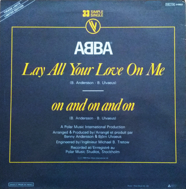 € 16.50 Media: Very Good Plus (VG+)Hoes: Very Good Plus (VG+)ABBA – Lay All Your Love On Me (12″, Single, Ltd)