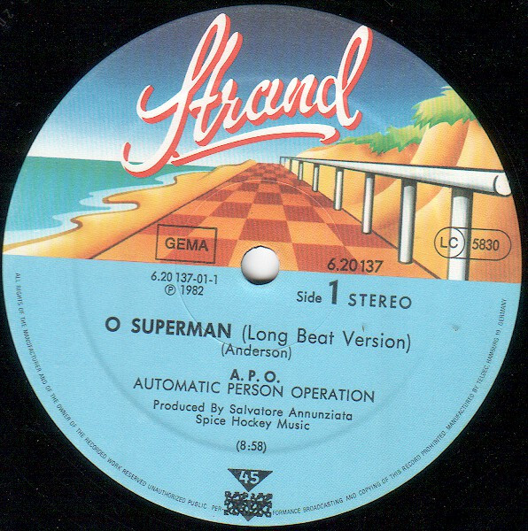 € 4.50 Media: Good Plus (G+)Hoes: Very Good (VG)A.P.O. – O Superman (12″, Maxi)