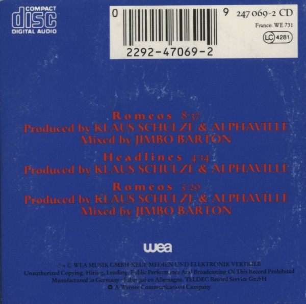 € 7.00 Media: Very Good Plus (VG+)Hoes: Very Good Plus (VG+)Alphaville – Romeos (CD, Mini, Single)