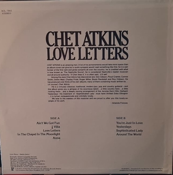 € 17.00 Media: Near Mint (NM or M-)Hoes: Very Good Plus (VG+)Chet Atkins – Love Letters (LP, Album)