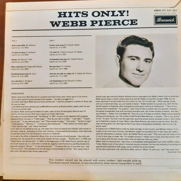 € 2.50 Media: Poor (P)Hoes: Very Good (VG)Webb Pierce – Hits Only (LP, Comp, Mono)