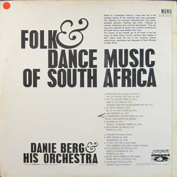 € 7.50 Media: Very Good Plus (VG+)Hoes: Very Good (VG)Danie Berg & His Orchestra* – Folk & Dance Music Of South Africa (LP, Album, Mono)