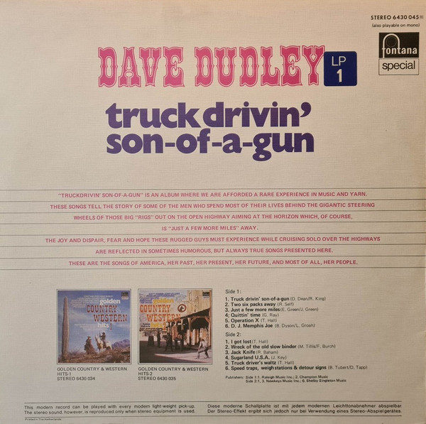 € 7.50 Media: Near Mint (NM or M-)Hoes: Very Good Plus (VG+)Dave Dudley – Truck Drivin’ Son Of A Gun (LP, Album)
