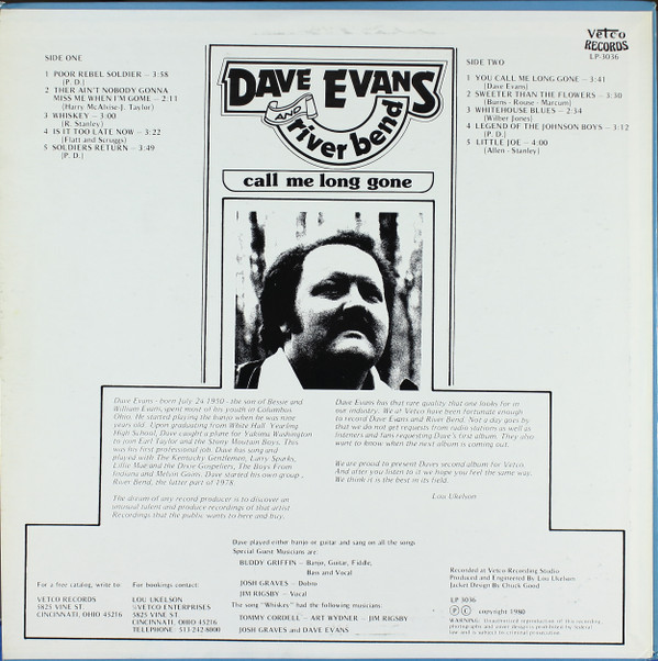€ 11.90 Media: Very Good Plus (VG+)Hoes: Very Good Plus (VG+)Dave Evans And River Bend – Call Me Long Gone (LP, Album)