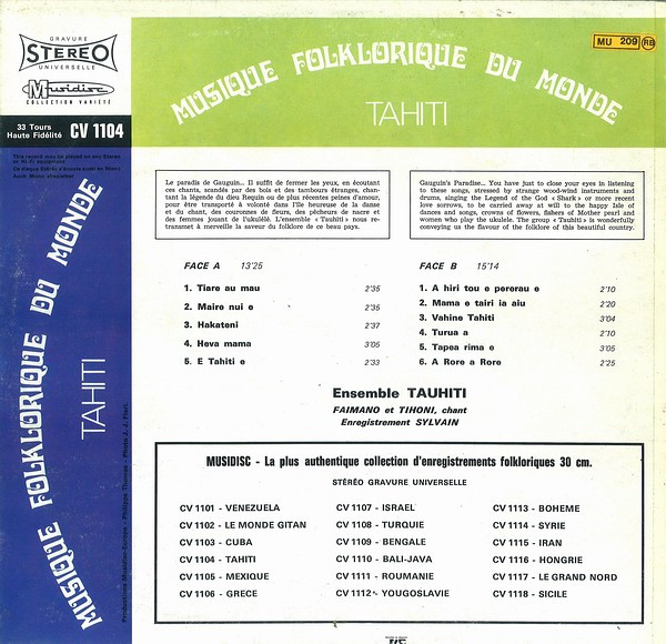 € 9.50 Media: Near Mint (NM or M-)Hoes: Very Good Plus (VG+)Ensemble Tauhiti* – Tahiti (LP, Album, RE)