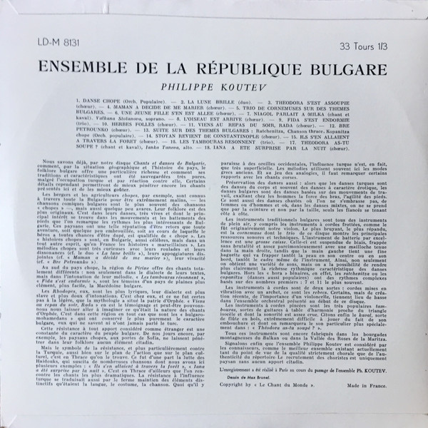 € 5.00 Media: Very Good Plus (VG+)Hoes: Very Good (VG)Ensemble Of The Bulgarian Republic, Philip Koutev – Musique De Bulgarie (10″, Album)