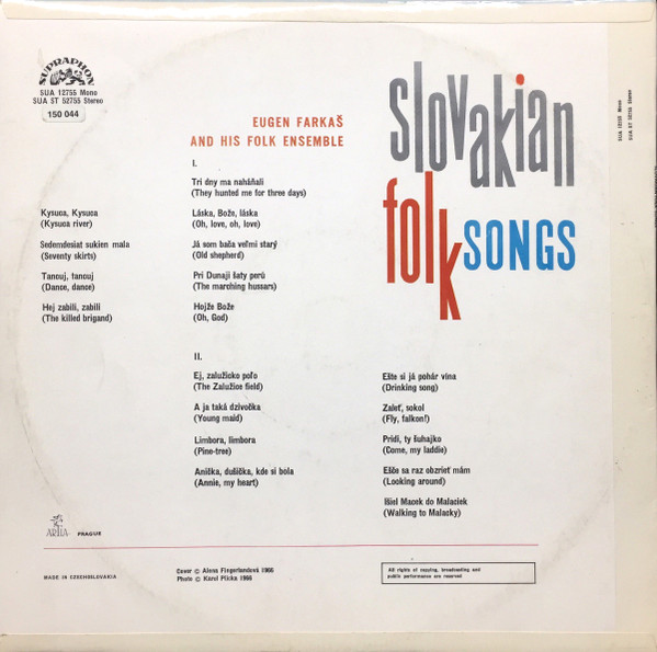 € 5.50 Media: Near Mint (NM or M-)Hoes: Very Good Plus (VG+)Eugen Farkaš And His Folk Ensemble* – Slovakian Folk Songs (LP, Album, Mono, Cze)