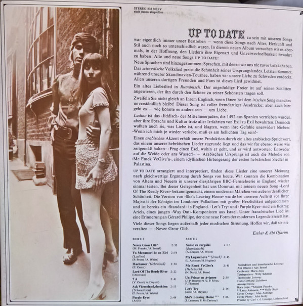 € 3.50 Media: Very Good (VG)Hoes: Fair (F)Esther & Abi Ofarim – Up To Date (LP, Album, Gat)
