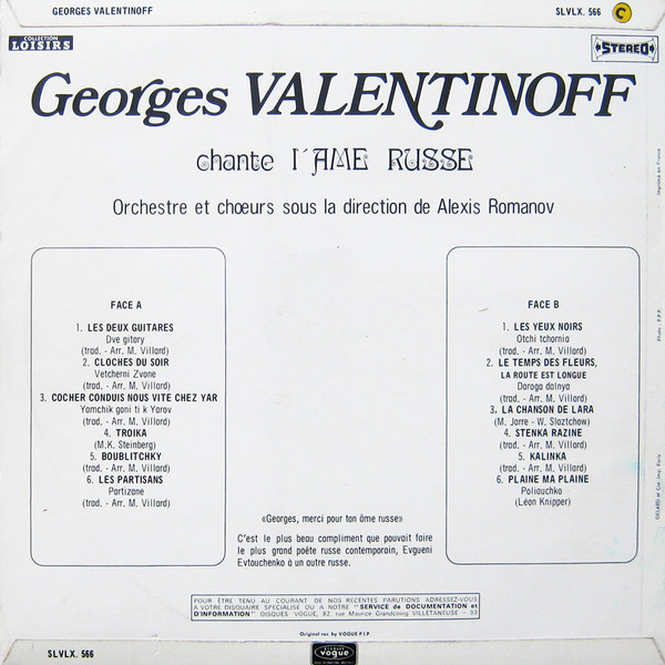 € 4.50 Media: Very Good Plus (VG+)Hoes: Very Good Plus (VG+)Georges Valentinoff – Chante I’Ame Russe (LP)