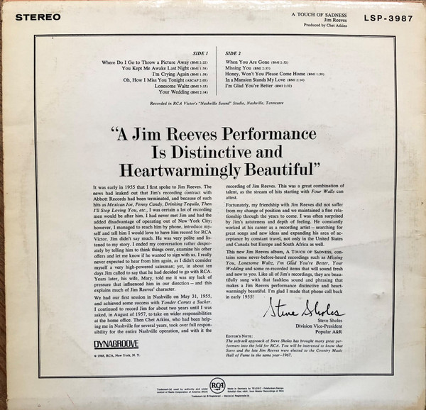 € 2.95 Media: Very Good (VG)Hoes: Very Good (VG)Jim Reeves – A Touch Of Sadness (LP, Album)