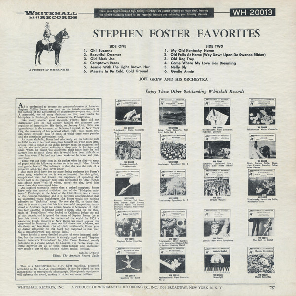 € 14.50 Media: Near Mint (NM or M-)Hoes: Very Good Plus (VG+)Joel Grew And His Orchestra – Stephen Foster Favorites (LP, Mono)