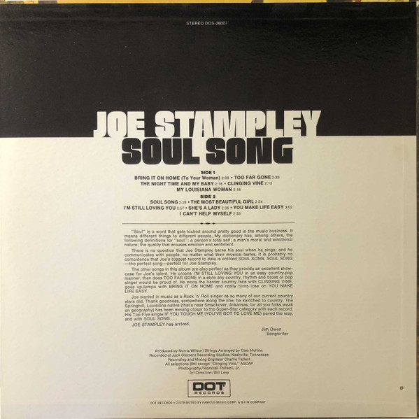 € 7.50 Media: Near Mint (NM or M-)Hoes: Very Good Plus (VG+)Joe Stampley – Soul Song (LP, Album, Mon)