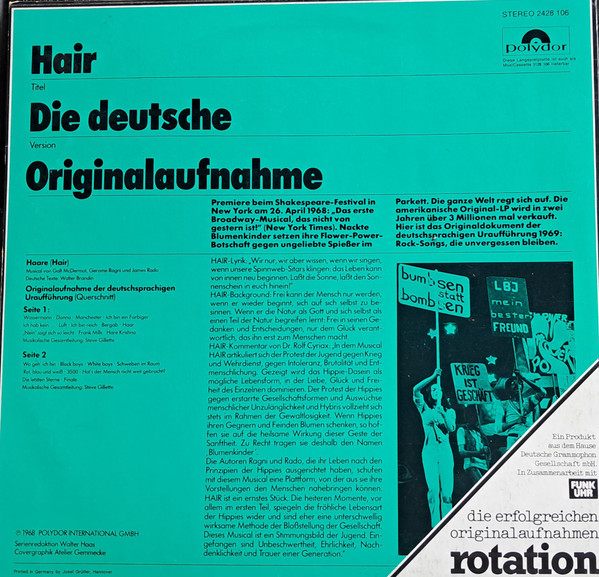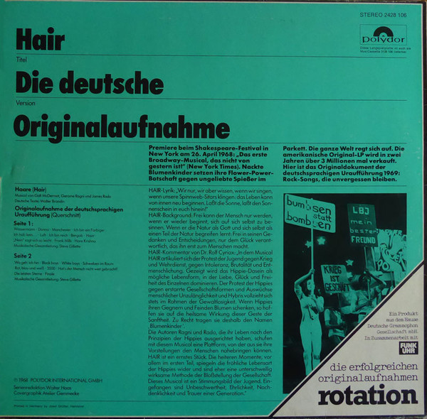 € 6.50 Media: Very Good (VG)Hoes: Very Good (VG)“Haare” Ensemble – Hair (Die Deutsche Originalaufnahme) (LP, Album, RE)