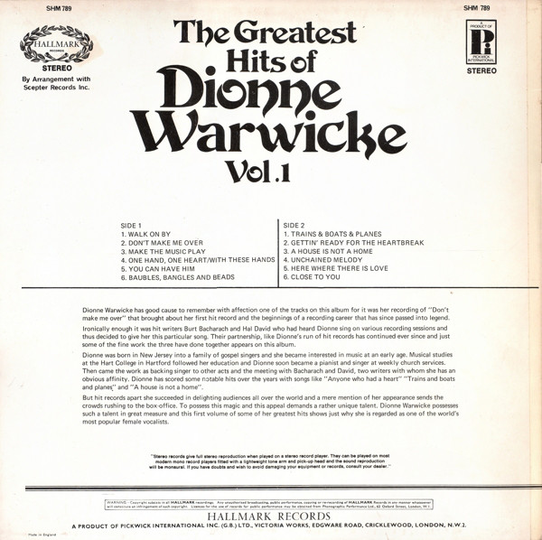 € 15.00 Media: Near Mint (NM or M-)Hoes: Very Good Plus (VG+)Dionne Warwick – Dionne Warwick’s Greatest Motion Picture Hits (LP, Comp)