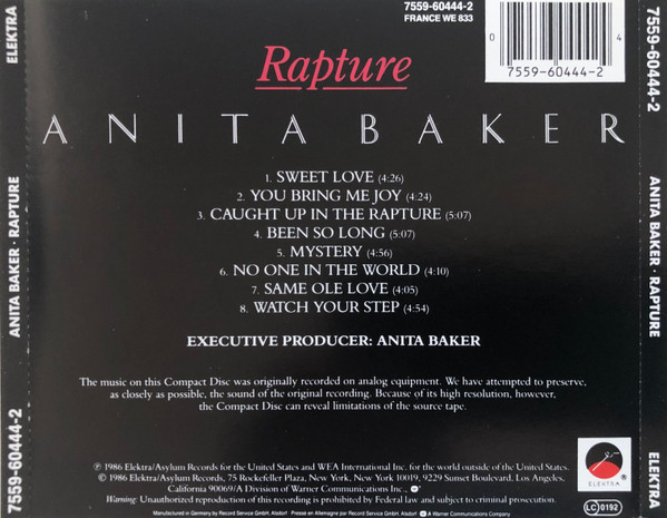 € 11.50 Media: Mint (M)Hoes: Mint (M)Anita Baker – Rapture (CD+G, Album)