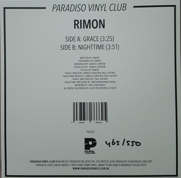 € 6.50 Media: Very Good Plus (VG+)Hoes: Very Good Plus (VG+)Rimon – Grace (7″, Single, Num, Yel)