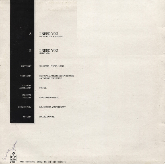 € 6.50 Media: Very Good (VG)Hoes: Very Good Plus (VG+)B.V.S.M.P. – I Need You (12″)
