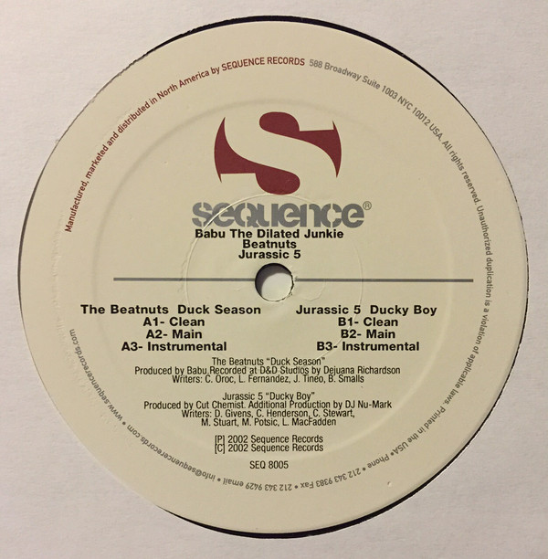 € 7.50 Media: Very Good (VG)Hoes: Very Good Plus (VG+)Babu Presents The Beatnuts / Jurassic 5 – Duck Season / Ducky Boy (12″, Single)