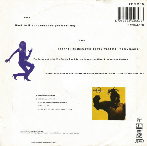 € 3.00 Media: Very Good Plus (VG+)Hoes: Very Good Plus (VG+)Soul II Soul – Back To Life (However Do You Want Me) (7″, Single)
