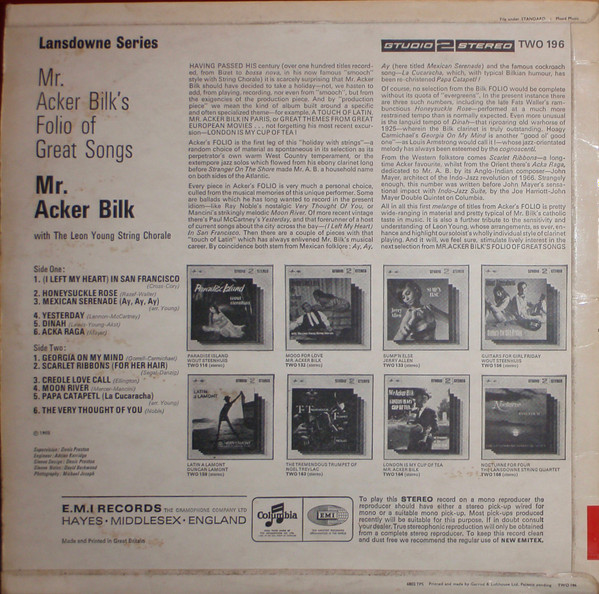 € 4.50 Media: Near Mint (NM or M-)Hoes: Very Good Plus (VG+)Acker Bilk And His Paramount Jazz Band – Mr. Acker Bilk’s Lansdowne Folio (LP, Album)