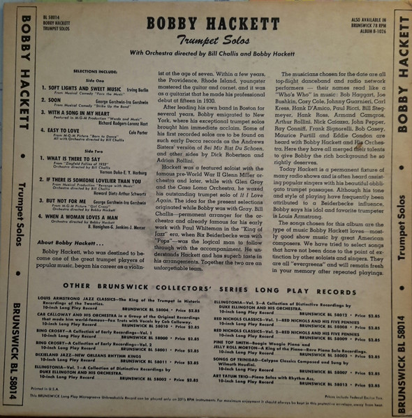 € 8.50 Media: Very Good Plus (VG+)Hoes: Very Good Plus (VG+)Bobby Hackett – Trumpet Solos With Bill Challis (10″, Album, Mono)