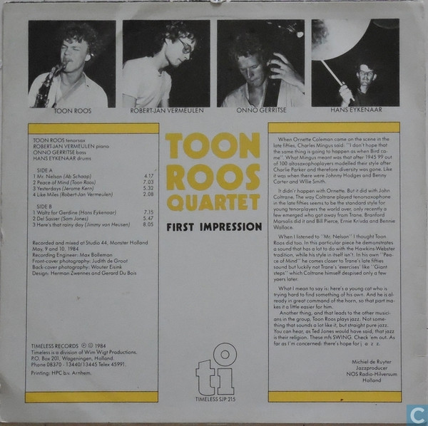 € 37.00 Media: Very Good Plus (VG+)Hoes: Very Good Plus (VG+)The Toon Roos Quartet – First Impression (LP)
