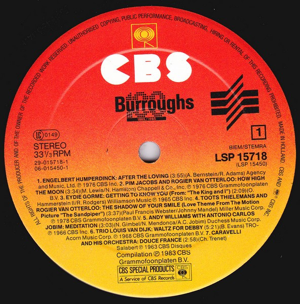 € 5.50 Media: Very Good (VG)Hoes: Very Good (VG)Various – Burroughs 1885 – 1985 (LP, Comp)