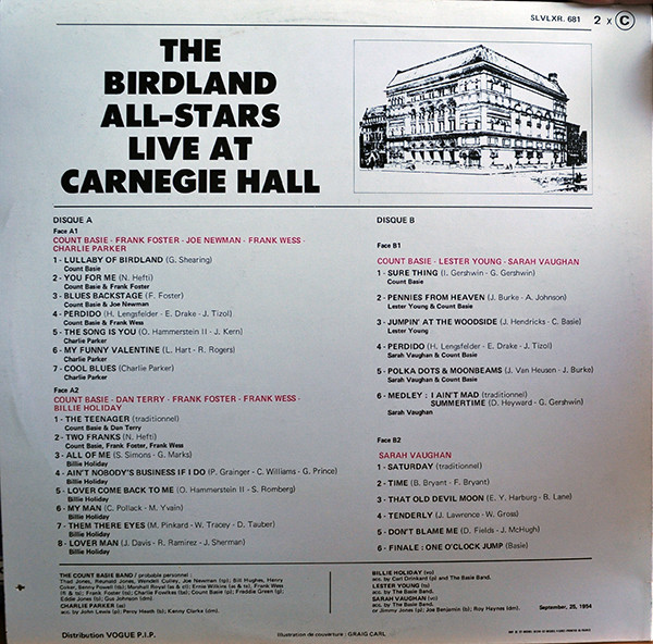 € 7.50 Media: Very Good Plus (VG+)Hoes: Very Good (VG)Various – Birdland All-Stars Live At Carnegie Hall (2xLP, Album)