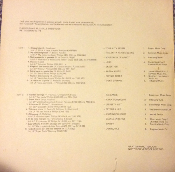 € 11.50 Media: Very Good Plus (VG+)Hoes: Very Good (VG)Various – Muzikale Tour ’73 – Demonstratie Elpee (LP, Comp, Promo)