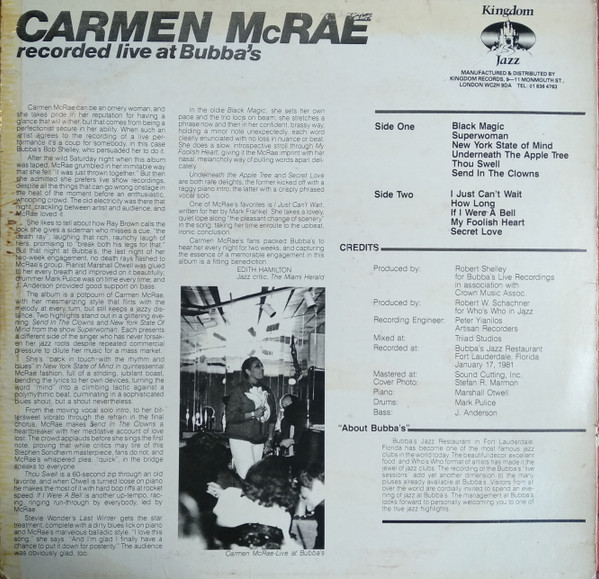 € 6.50 Media: Very Good (VG)Hoes: Very Good (VG)Carmen McRae – Recorded Live At Bubba’s (LP, Album)