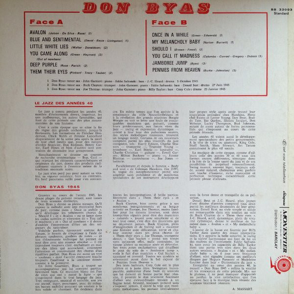 € 8.00 Media: Very Good Plus (VG+)Hoes: Very Good Plus (VG+)Don Byas Et Ses Rythmes – Don Byas Son Tenor Sax Et Ses Rythmes (LP, Comp, Dee)