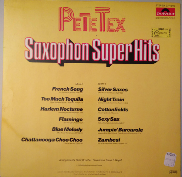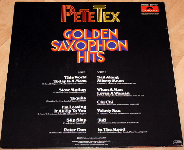 € 6.50 Media: Very Good Plus (VG+)Hoes: Very Good Plus (VG+)Pete Tex – Saxophone Super Hits (LP)