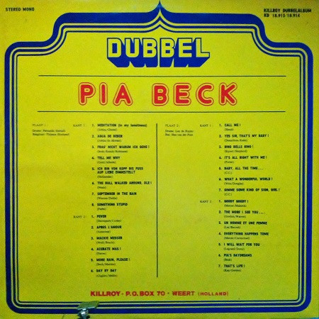 € 4.95 Media: Very Good Plus (VG+)Hoes: Very Good Plus (VG+)Pia Beck – Dubbel Pia Beck (2xLP, Album, Comp, Gat)