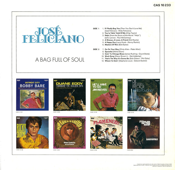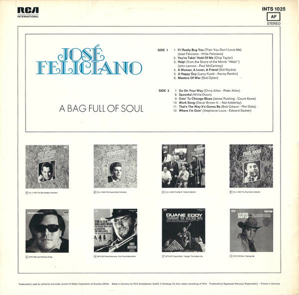 € 3.50 Media: Good (G)Hoes: Very Good (VG)José Feliciano – A Bag Full Of Soul (LP, Album, RE)