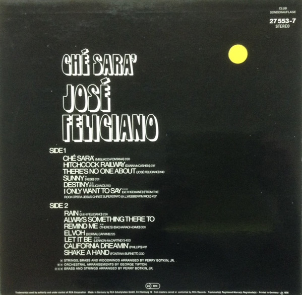 € 6.50 Media: Very Good Plus (VG+)Hoes: Very Good Plus (VG+)José Feliciano – Ché Sara’ (LP, Album, Promo, Gat)