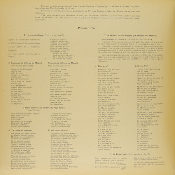 € 4.50 Media: Good Plus (G+)Hoes: Very Good (VG)Various – Chants De La Guerre D’Espagne (LP, Comp, RE)