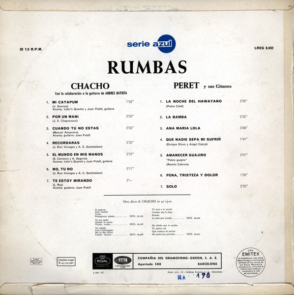€ 5.50 Media: Good Plus (G+)Hoes: Very Good Plus (VG+)Chacho / Peret Y Sus Gitanos – Rumbas (LP, Album, Mono)